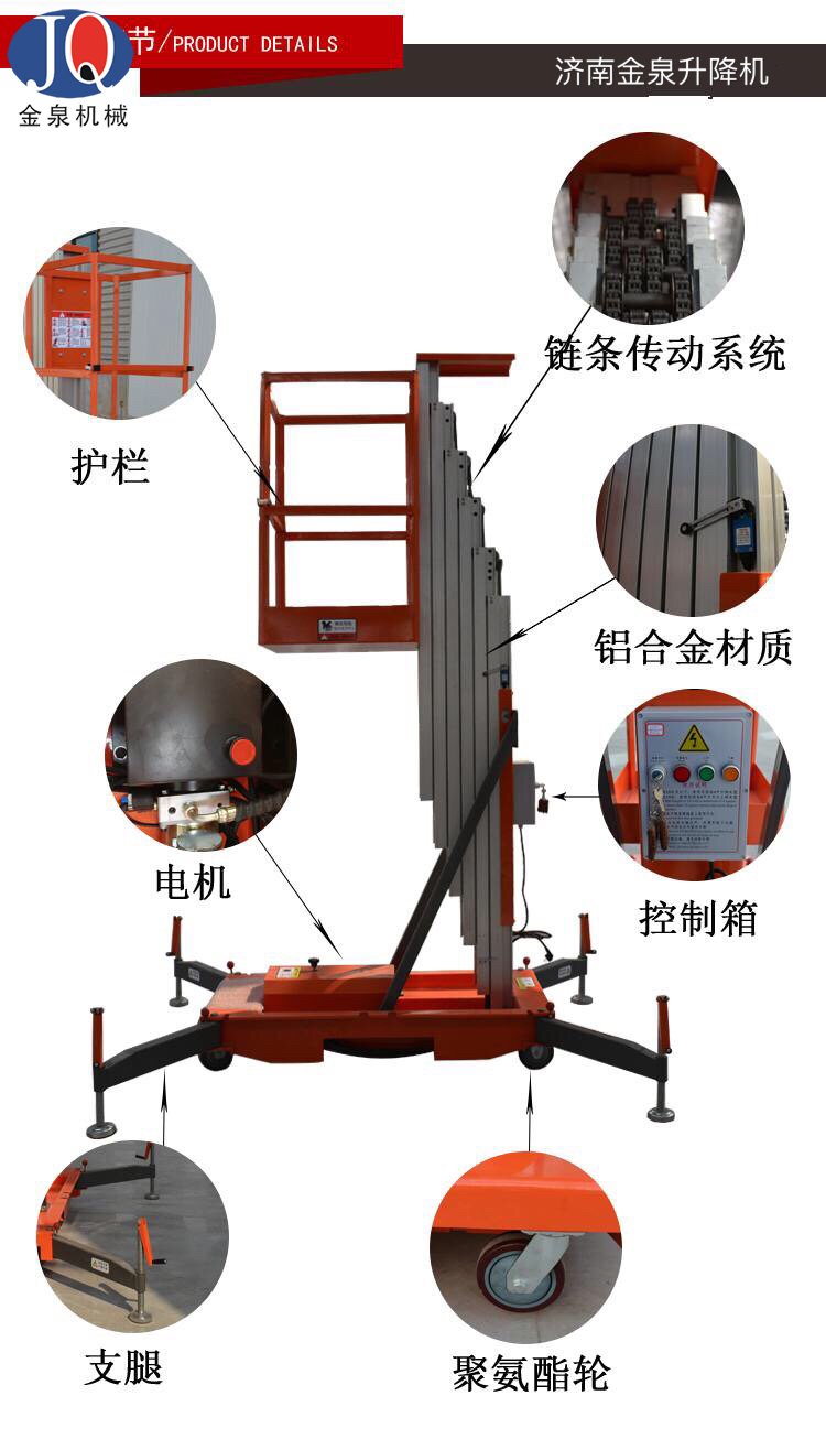 采用高強度優質鋁合金材料,具有造型美觀、體積小、重量輕、升降平穩、安全可靠等優點,并能夠上下操作,平臺載重100kg, 適合單人快速登高作業,可輕松穿越電梯門廳,被廣泛用于工廠、賓館、餐廳、商業建筑、車站、機場、影劇院、展覽館等場所。