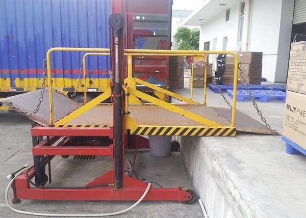 4. 在裝卸貨時,貨物推上平臺后,應將平臺前面的防護鏈條掛上,預防貨物滑落。