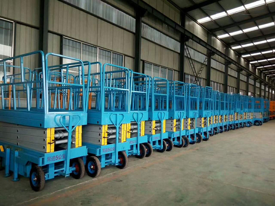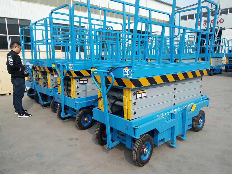 移動剪叉式升降平臺主要技術特點:臺面鋼板折彎、底架及剪叉結構山鋼定做高強度矩形管材; 標準冷彎槽做道軌,使用尼龍滑塊做導軌輪,接觸面大,升降平穩,晃動小;液壓油缸 內置防爆閥(防止油管斷裂,平臺失速下降),采用進口密封圈,經久耐用,不泄露;雙層鋼網高壓油管;升降機專用液壓泵站,加裝應急下降閥,平臺斷電可手動控制 下降,內置溢流閥,可防止上行運動時系統壓力過高,起到超載保護功能;充氣橡膠輪胎; 電路電器、接觸器羅列連接,加裝熱過載保護,缺相保護等安全保護功能;電動上、下電動控制,控制按鈕盒加裝急停按鈕,以最大限度保障財產及人身安全,各操作部分使用24V安全控制電壓;軸銷圓鋼配做,調質處理;拋丸、噴砂 除銹處理,除去鋼結構構件表面的銹蝕及焊接飛濺,能使鋼構件表面產生一定程度的凹凸不平的效果,增大粉末的附著力;使用靜電粉末噴涂;涂層外觀質量優異,附著力及機械強度強,色澤亮度高,經久不褪色。