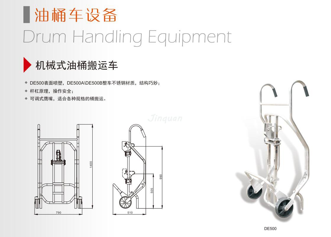 機械式油桶搬運車DE500 1.DE500表面鍍鋅處理,結構巧妙 2.杠桿原理,操作安全 3.可調式鷹嘴,適合各種規格的桶搬運